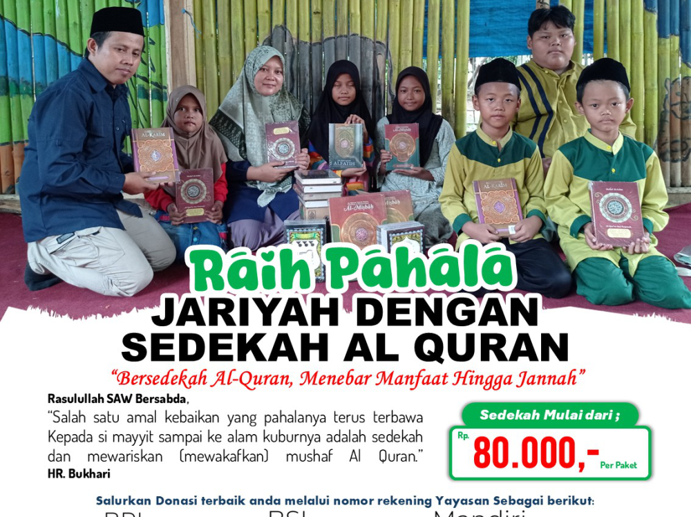 Berbagi kebaikan dengan mendukung penyebaran Al Quran, menjadi amal jariyah yang pahala  terus mengalir selamanya.